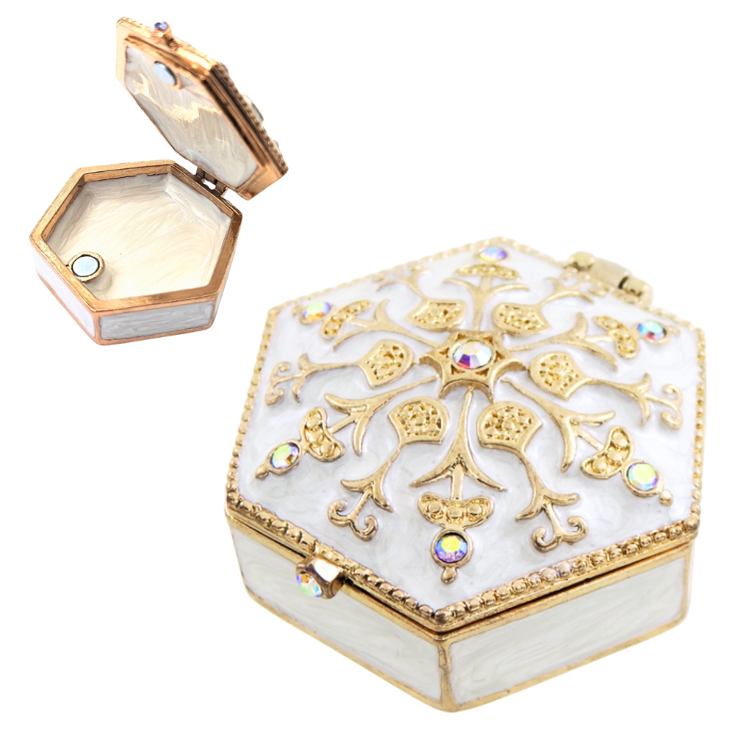 Szkatułka B0035-08WH to idealny sposób na okazanie bliskiej osobie, jak bardzo Ci na niej zależy. To bogato zdobione metalowe pudełeczko z kryształkami o wymiarach 5x5x2cm.