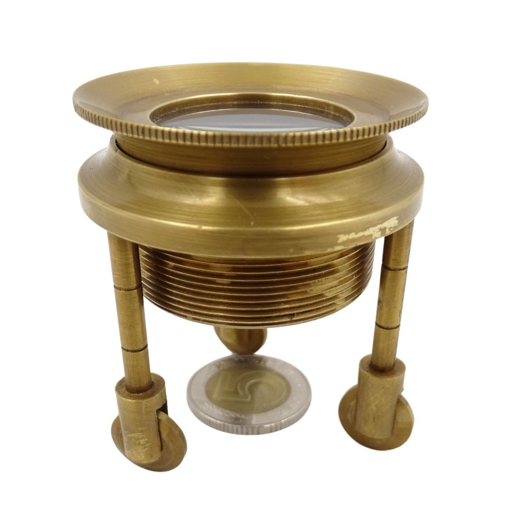 Soczewki lupy w mosiężnej obudowie posadowione są na trójnogu, co pozwala na korzystanie z lupy bez użycia rąk. Konstrukcja na kółkach dodatkowo poprawia jakość użytkowania.