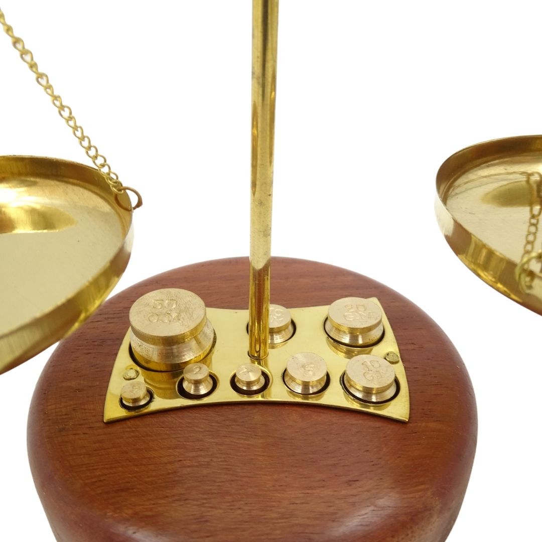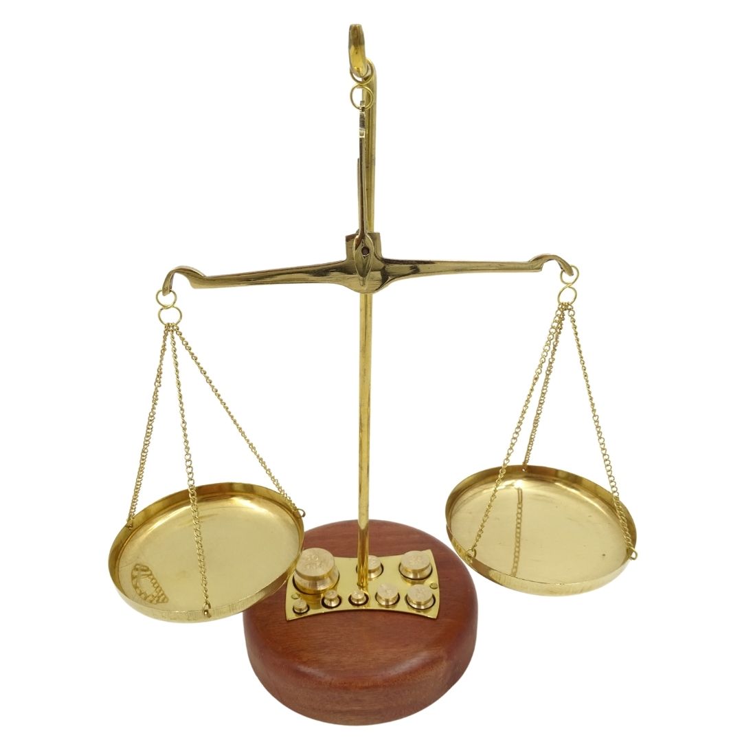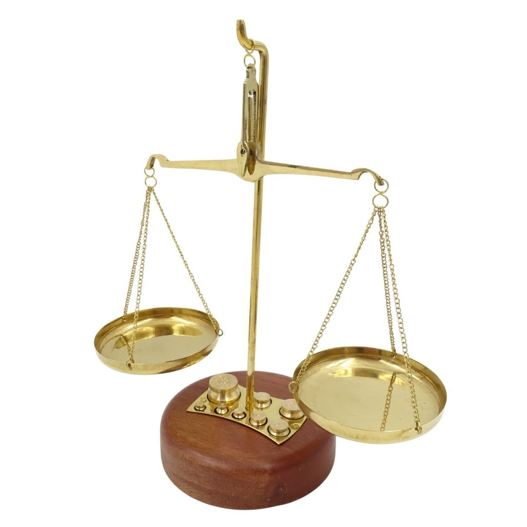 Waga wykonana z mosiądzu z drewnianą podstawą. W skład zestawu wchodzi również 8 odważników.
